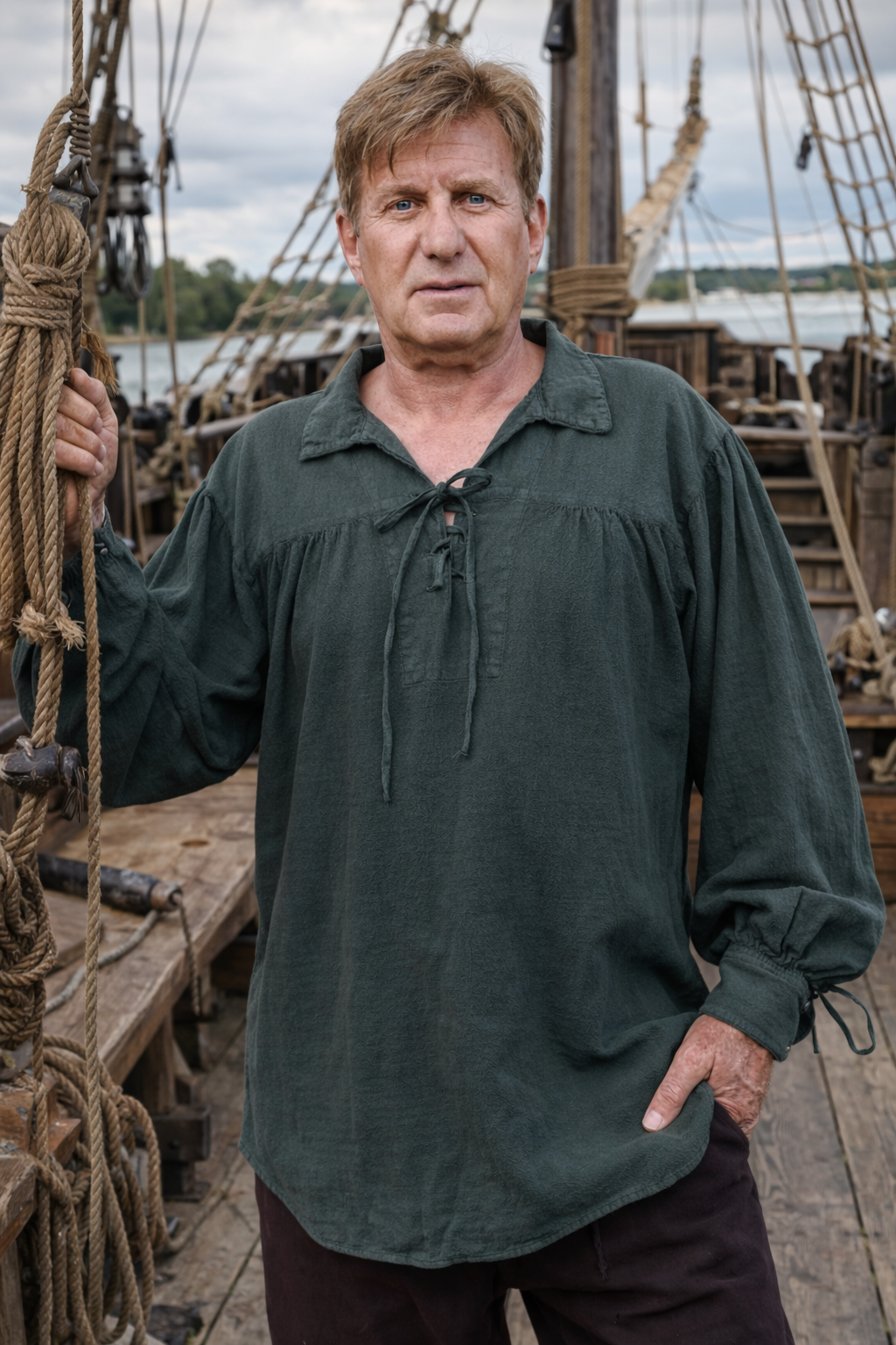 The Buccaneer Shirt is a classic seafaring garment inspired by historical pirate and maritime attire. Crafted from breathable woven cotton, this shirt is designed for comfort, durability, and authentic character. Its relaxed fit allows ease of movement, making it ideal for long days at festivals, fairs, or on deck.