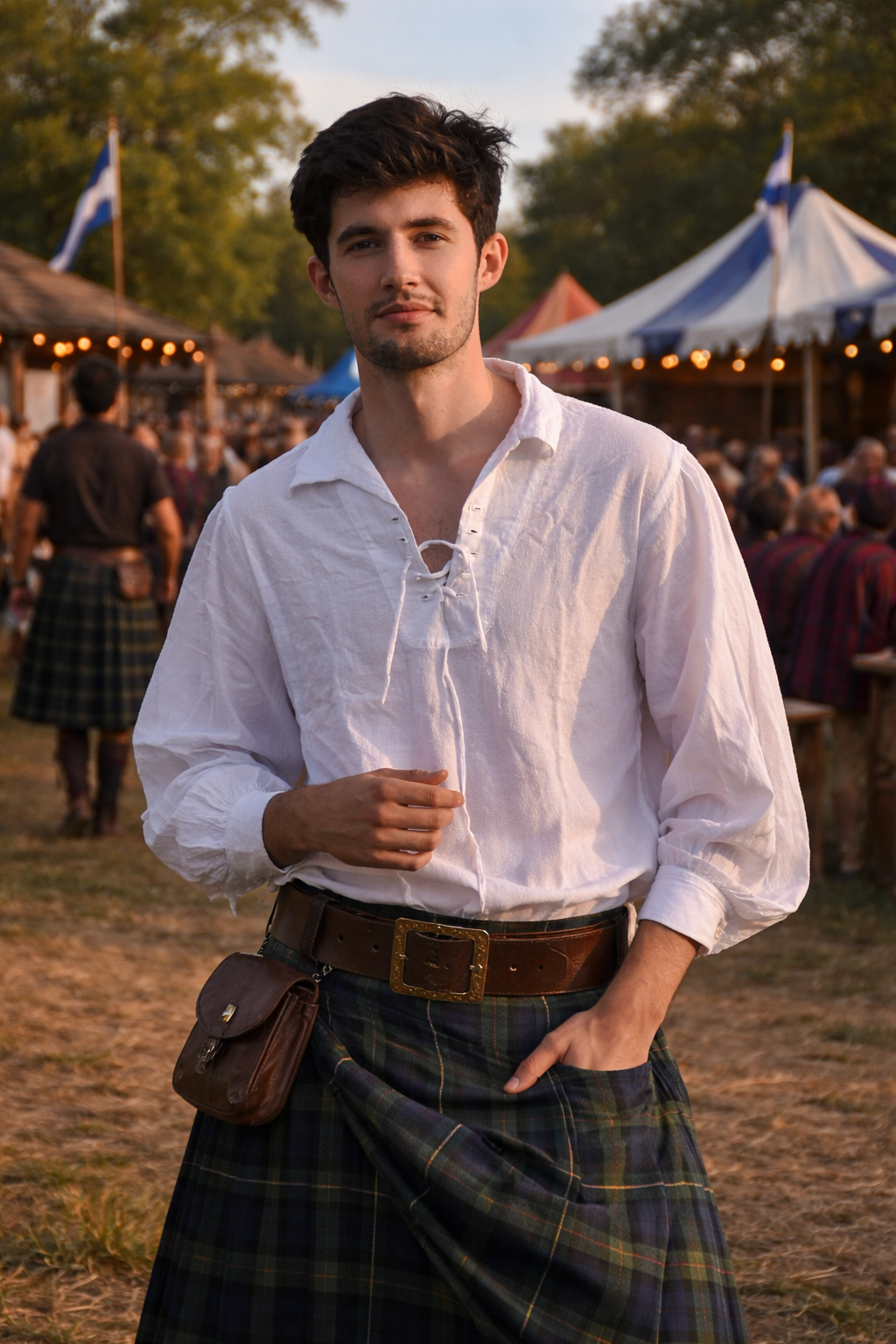 The defining lace-up neckline reflects classic Jacobite style, allowing adjustable wear while maintaining a rugged, historical look. Full-length sleeves with tie cuffs add period-correct detail and practical adjustability. Worn loose or tucked, this shirt pairs naturally with kilts, trousers, belts, and boots.