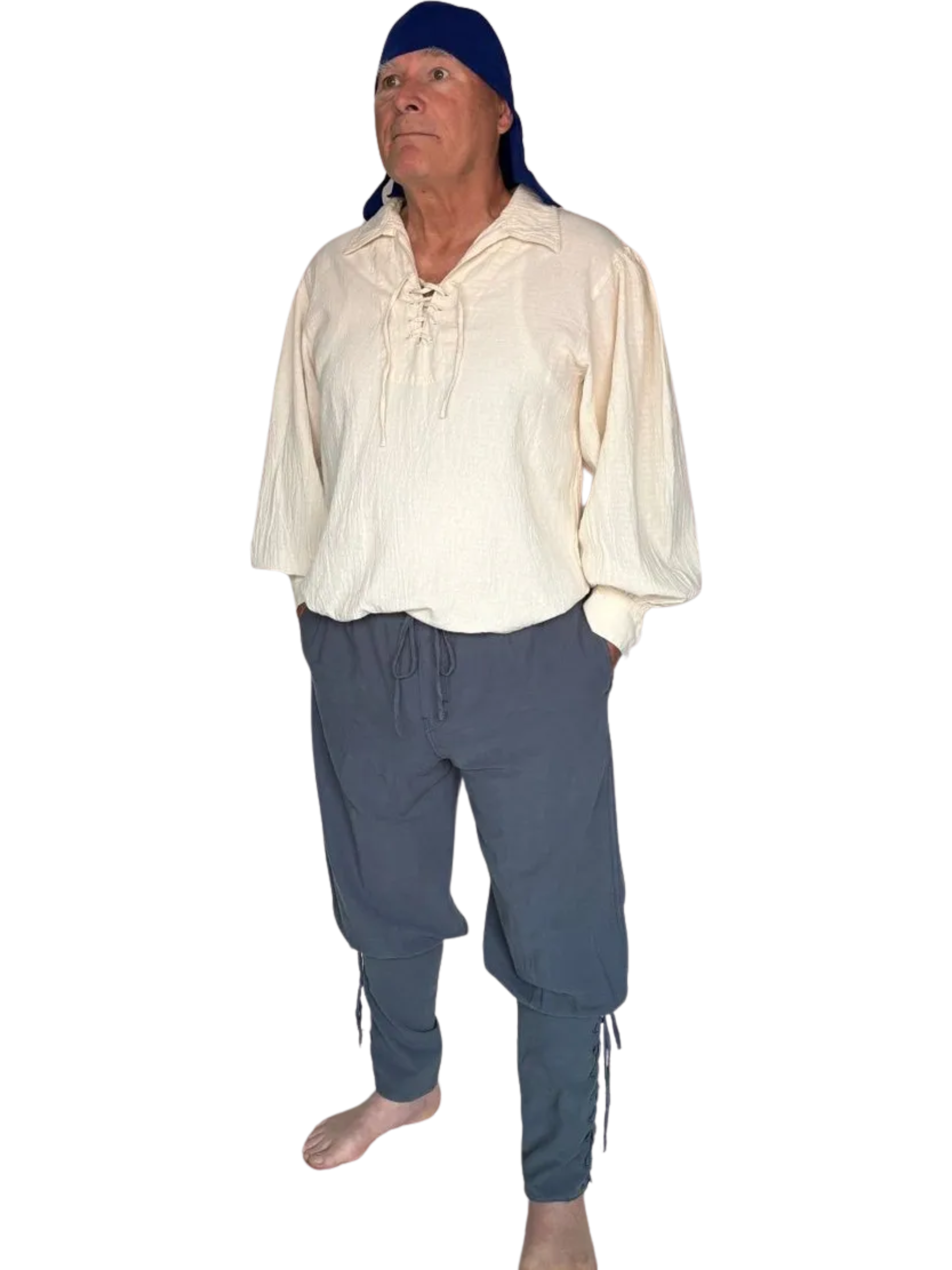 Designed for both battle and comfort, the Stormforged Warrior Pants feature a sturdy drawstring waist for an adjustable fit. The tapered cuffs, secured with rugged ties, make them perfect for pairing with boots or wearing barefoot. Crafted from durable, breathable fabric, these pants provide freedom of movement, making them ideal for warriors, reenactors, and adventurers alike.